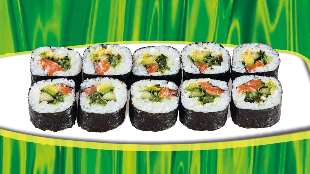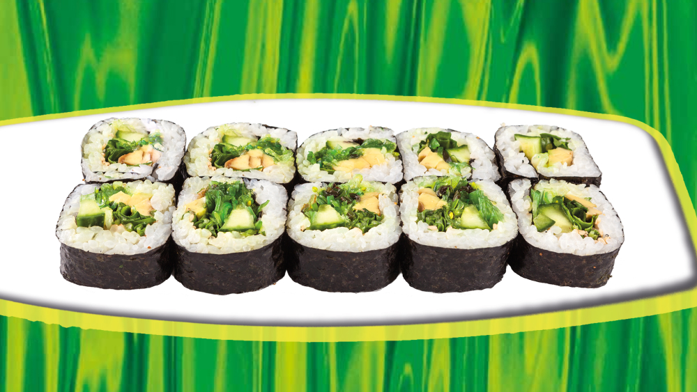 - 10x Futo Green (große Maki-Rollen mit Avocado, Gurke, Rucola, >Wakame2,16, Frischkäse)